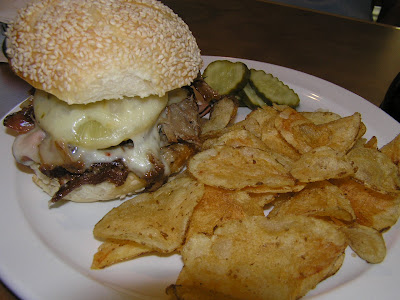The wife ordered The Captain Jack Sparrow. Pulled pork, ham, pineapple, and sweet onion simmered in pineapple-rum sauce and served on a kaiser with melted pepperjack and mayo. $8.50 (all the sandwiches on the menu are $8.50)